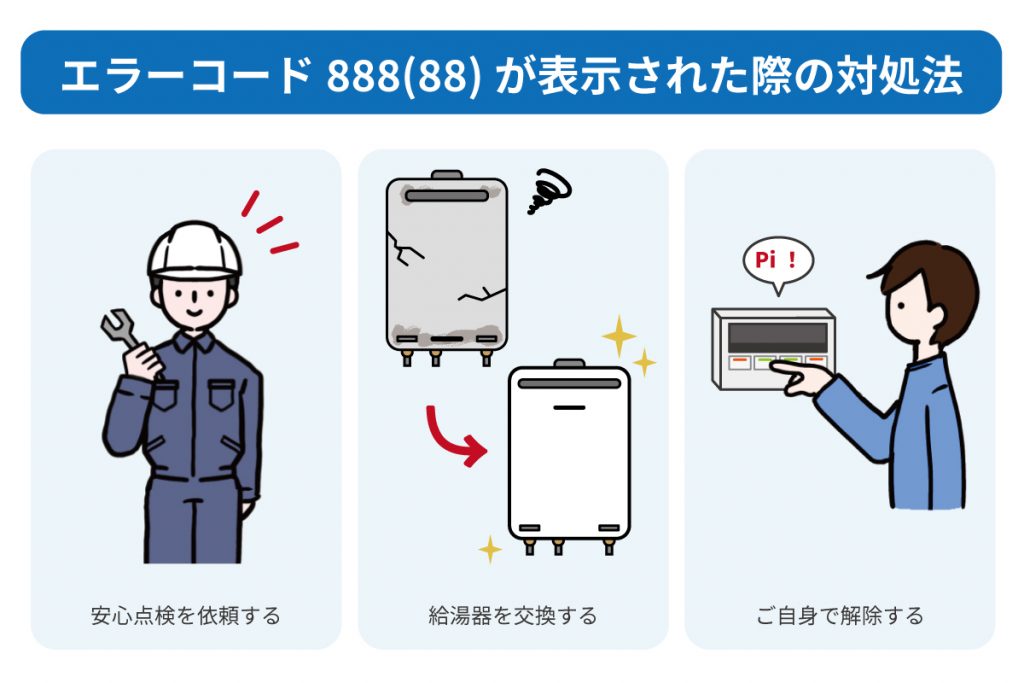 リンナイ、ノーリツ、パロマなどの各メーカーは、エラーコード888(88)が表示された際に、あんしん点検を受けるか、給湯器自体の交換を検討するよう呼びかけています。