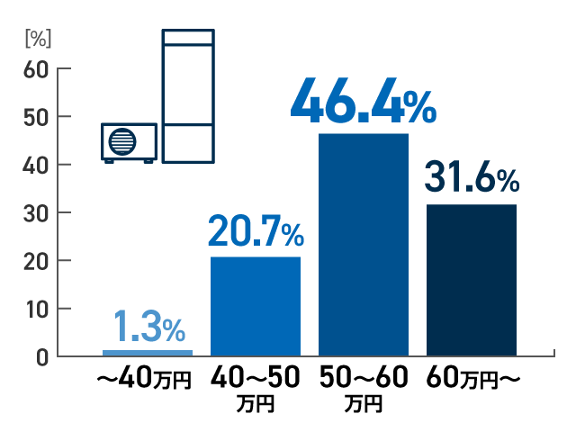 エコキュートをお選びいただいたお客様の7割近くが60万円未満の範囲でご購入されています。空気の熱を活用するため消費電力を大幅に削減でき、夜間の安い電力を使うことで光熱費を安く抑えます。