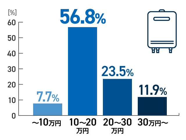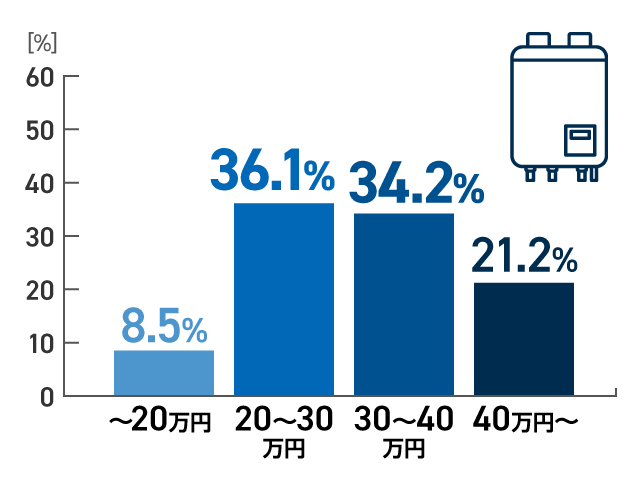 約6割のお客様が20万円未満で交換されており、⼯事まで完了しています。初期費⽤を抑えたい⽅に最も選ばれている給湯器です。
