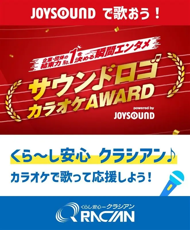 水まわりのプロフェッショナル企業、株式会社クラシアン(本社:神奈川県横浜市、代表取締役社長:今田 健治、以下「クラシアン」)は、JOYSOUND(株式会社エクシング)が主催する音楽イベント「サウンドロゴカラオケAWARD」に参加いたします。 これに伴い、2025年12月1日(月)より全国のJOYSOUND導入店舗にて、当社のサウンドロゴのカラオケ配信が開始されます。 本企画は、企業サウンドロゴを本気で歌い上げ、その歌唱回数や採点結果を競うユニークなイベントです。日本を代表する作曲家・小林亜星氏が手掛けたこのメロディを、ぜひ皆様の歌声で響かせて応援してください。