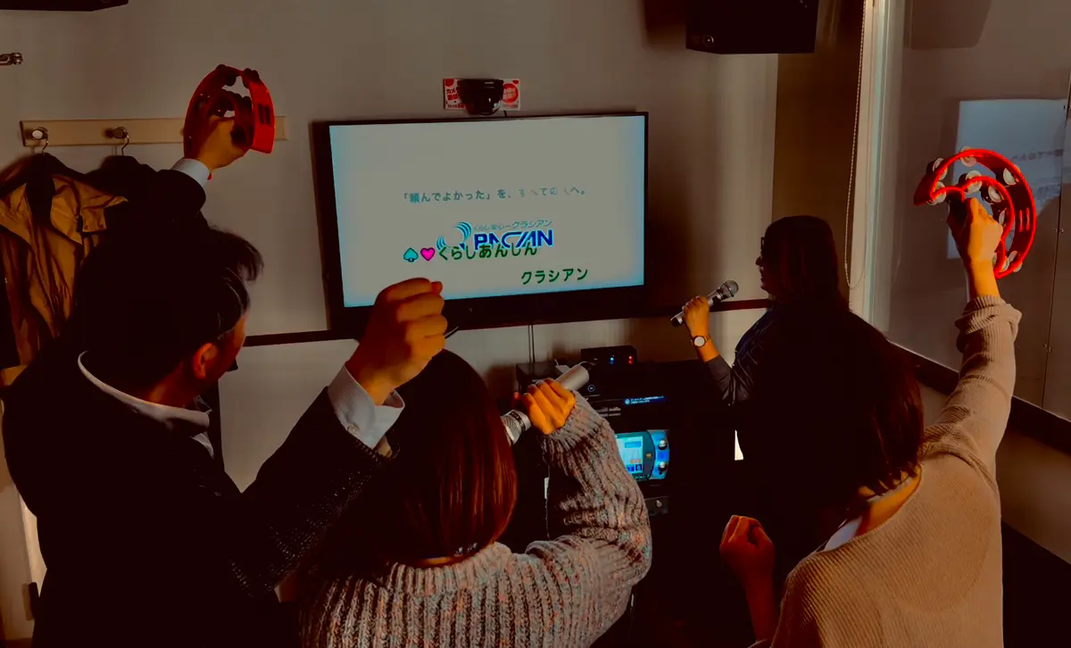 カラオケでサウンドロゴを熱唱するクラシアンのメンバー