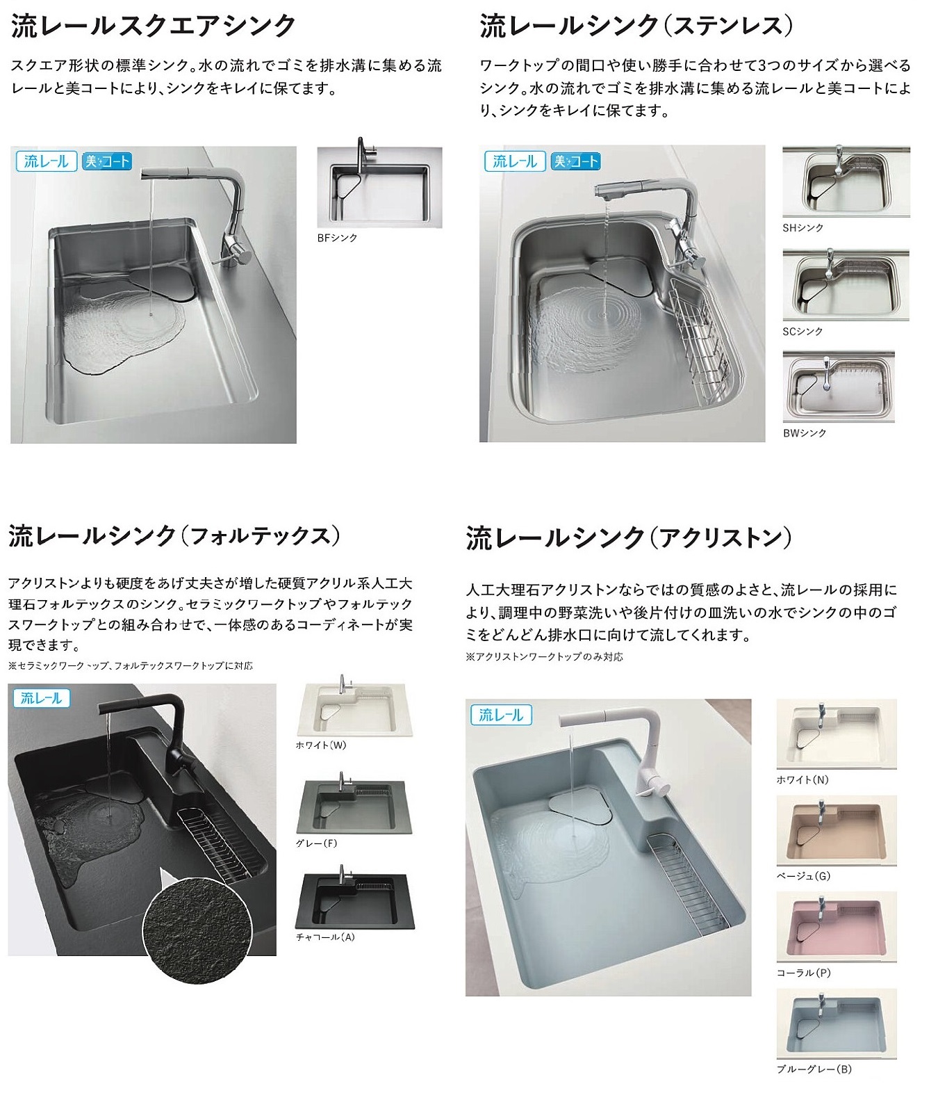 ステンレスワークトップ汚れと傷をWガードする「美コートワークトップ」。親水性のセラミック系特殊コーティングで、汚れの下に水を引き込むので、しつこい汚れも浮かしてスッキリと拭き取れます。錆びにくく細かな傷が付きにくいから、硬質な美しさを長くキープすることが可能です。