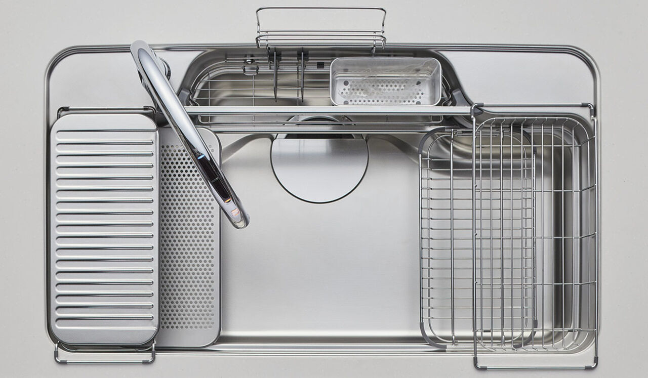 2段レーン×2種プレートのかけ合わせにより、キッチンワークの作業効率をアップ。プレートを利用することで、粉が飛び散るような下ごしらえ作業もシンク内で行うことができます。シンク底面は両端に行くほど傾斜が大きく、水がスムーズに流れる設計。ナイアガラフロー方式で効率的に排水されます。