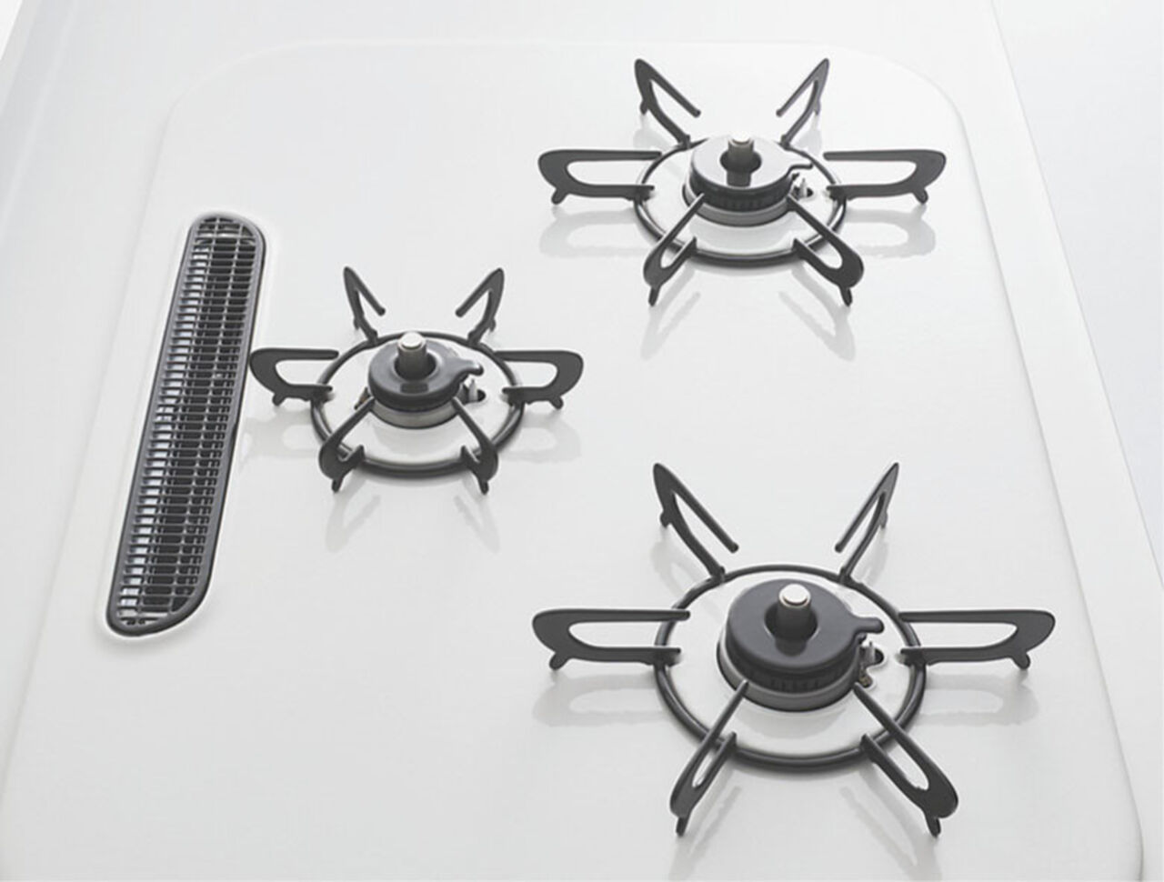バーナー間隔が広く設計された「ひろまるコンロ」は、3つの鍋を同時に使っても鍋振りができる程スペースをたっぷりと確保。左右二箇所にある仮置きスペースを活用し、最大5つまで鍋を同時に使い分けることができます。汚れがたまりやすい継ぎ目がないので、お掃除も簡単です。