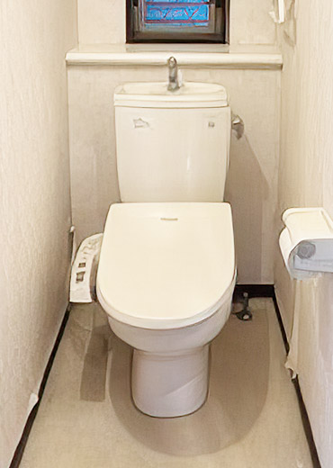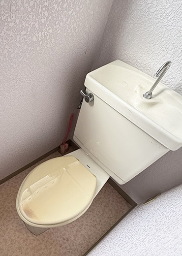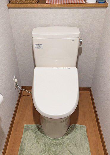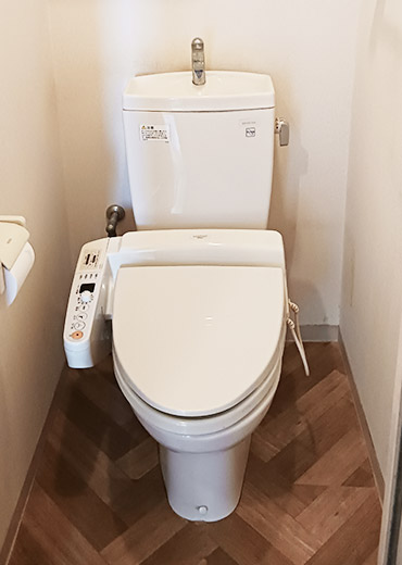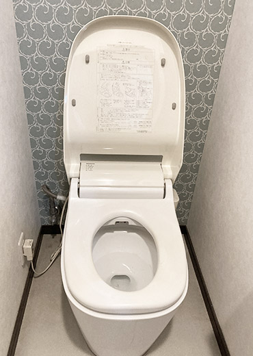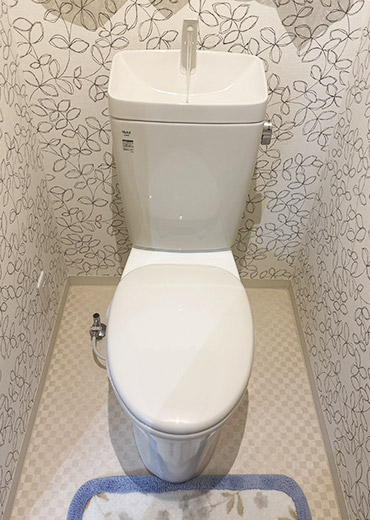 壁に設置された平付タンクから密結タンクのトイレへ交換しました。 内装も一新することで、壁や床に残ってしまう古いトイレを外した跡が見えなくなりました。