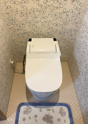 お客様と相談して埃のたまりやすいトイレタンクの手洗いは付けず、トイレの前に設置された洗面を使用しました。トイレ室内は明るい印象になるように白地にグリーンで植物が描かれた壁紙に変更して、つなぎ目がなく掃除しやすい除菌機能が付いたウォシュレットを設置しました。