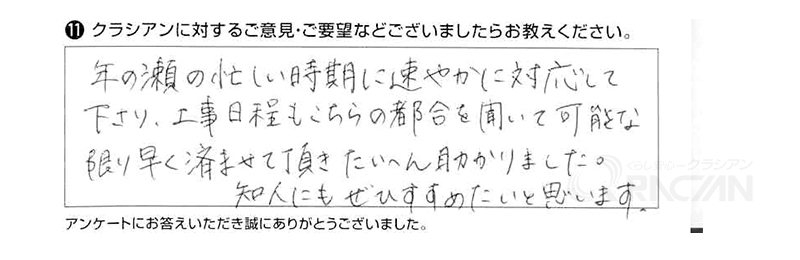 年の瀬の忙しい時期に速やかに対応して下さり、工事日程もこちらの都合を聞いて可能な限り早く済ませていただき、大変助かりました。知人にもぜひすすめたいと思います。